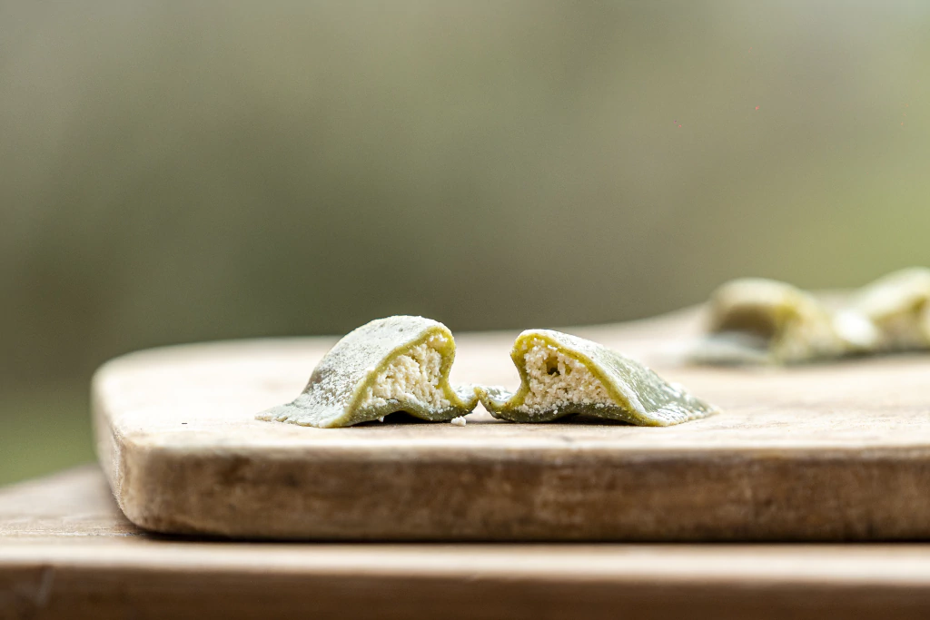 Nuestros raviolones están rellenos de suave ricota y ciboulette fresco, envueltos en una masa de harina integral con un toque de espinaca deshidratada.